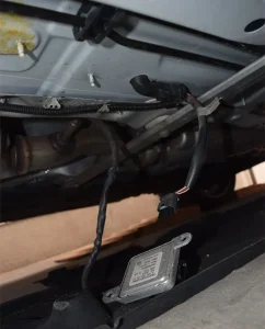 こんなとこにあるんかい。あ、でもこのまま肩を滑らせれば届くか?と体を潜り込ませるとなんとかアクセス出来た。問題は、モジュールが両サイドの起毛アンダーカバーの中に潜り込んでいる事。リフトで高く持ち上げられたら何個かのクリップを外せばアクセスできそうだが、肩を潜らせるのがやっとの状況ではそれでは外せない。