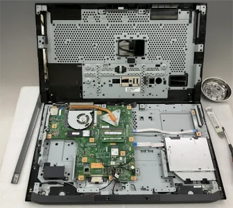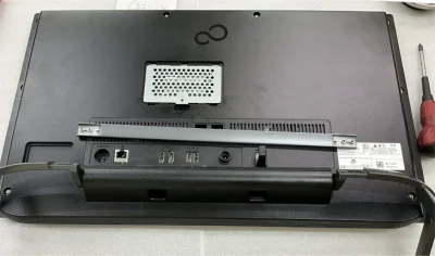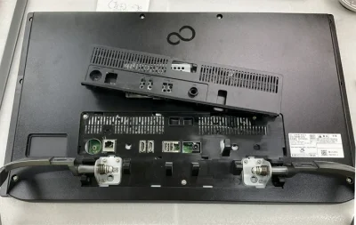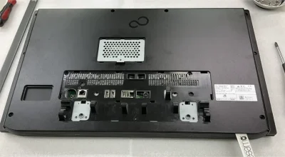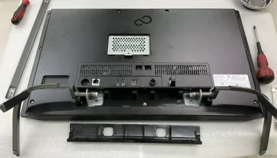 幾度となくパソコンの分解清掃修理を行ってきたが、確かに富士通さんのPCはなかなか難解な構造をしている。今回は、久しぶりにデスクトップオールインワンPCの分解である。この手はどのメーカーでも面倒くさい。中身はノートPCだが、外観がモニターになっているので、あちこで無理が掛かっている。
